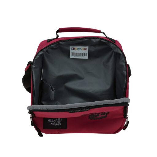 Lonchera Miles Morales Chenson Grafo en color tinto, con diseño de serigrafía vibrante. Su amplio compartimento principal con cierre y elástico interior para botella te permiten organizar tus alimentos de manera eficiente. Con asa larga ajustable, asa de mano, forro térmico y banda trasera para mochilas con ruedas. ¡Lleva tu lonchera con estilo!